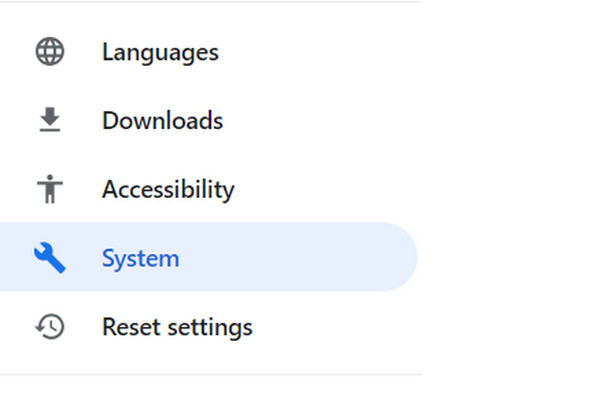 Step 1Open your browser and click the three-dotted button in the upper right corner. Click Settings. Then, at the lower part of the menu, click on System.