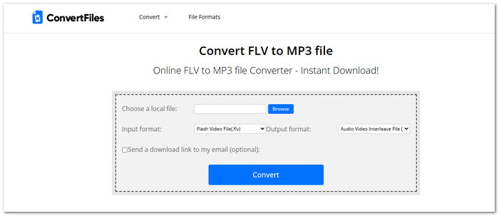 It does not have a lot of features, but ConvertFiles gets the job done. You upload your file, choose MP3, and convert it. You can also paste a video link to convert it straight from the internet. This FLV to MP3 converter is totally free. But the website looks old. There are ads on the page, which can be annoying.