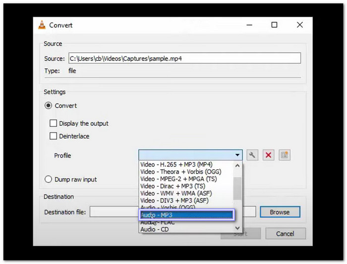 Step 5Hit Browse to pick where to save your MP3 file. Name it and add .mp3 at the end. Click Start to begin, and please wait for VLC to finish the job.