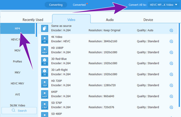 Step 2Next is to set the output to MP4. To do so, click the drop-down arrow from the Convert All To portion, and look for the MP4 selection to click.