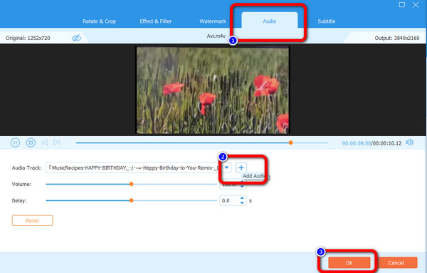 Step 3Another interface will appear on the screen. Select the Audio section and click the Add button to add your own music to Instagram post or story video. Then, click the OK button. After that, you can click the Convert All button to finish the process and save it on your computer. Then, you can post the video on your Instagram.
