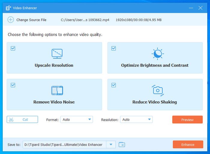 Step 4Depending on your needs, choose among the presented four options. Click on Preview to view the enhanced video. If you are content with it, set the format, resolution, and destination directory. Then, click on Enhance to get your clear video.