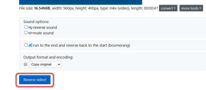 Another video reverser online that many people use is Ezgif. Many people love using this online tool to reverse videos because it allows you to reverse or mute your video's sound. In addition, it has an easy-to-use user interface, which makes it a beginner-friendly application. Ezgif also contains many editing features, such as a file converter, online video crop, video resizer, and more. A little drawback of Ezgif is that it contains ads that might distract you while reversing your video. However, it is still an excellent online application to reverse your videos because it is free and safe to use.
