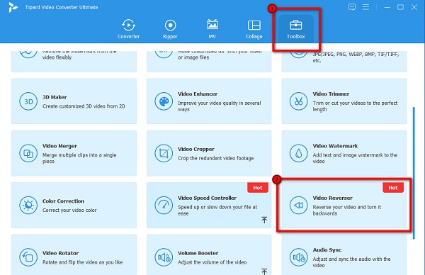 Step 2And then, navigate to the Toolbox panel above the software's interface. And then, you will see the set of editing features you can use. Select the Video Reverser feature from the list of tools.