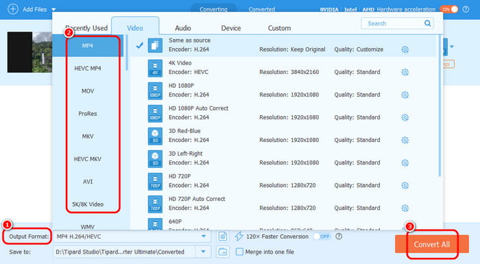 Step 5 To export, select your desired output format from the Profile option. After selecting a format, try exploring the Device tab and choosing which orientation fits most for your vlog. Finally, click the Convert All button.