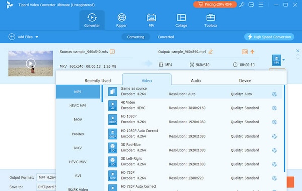 Tipard Video Converter Ultimate is the best solution for converting MKV to MP4 on Windows and Mac with only a few simple clicks. It can convert MKV videos with any encoder and export them to MP4 formats with HEVC, AV1, H.264, or other popular or rare codecs. You can also upscale your video to 4K, 5K, and even 8K. Moreover, this MKV to MP4 converter supports batch conversion and GPU acceleration, which means the conversion speed will be very fast no matter the quantity or size of your MKV input.
