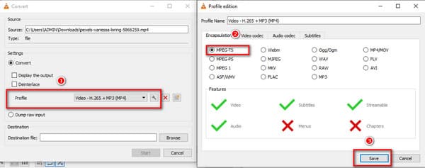 Convert MKV to M2TS with freeware VLC Media Player. You may think twice that using this program will not meet your goal. But you're mistaken because VLC offers a converter tool. The good thing about it is that it can convert your videos into many file formats. Also, you can convert many files into a single conversion process. Note that two or more files will take so much of your time. Besides, you can convert AV1 videos to H.264/H.265 if needed, check AV1 vs H265 vs H264 comparison here.