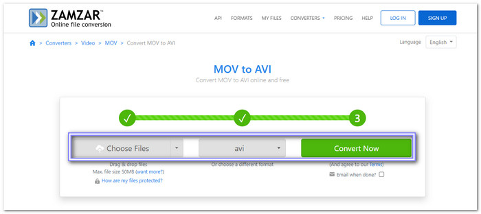 Zamzar is a widely known MOV to MP4 converter that is free to use online. But besides MP4, you can also use it to convert MOV to AVI. Although it is easy to use, you need to type your email address to receive the converted video. It may not be ideal for everyone, but it remains a straightforward option for those who need a simple conversion.
