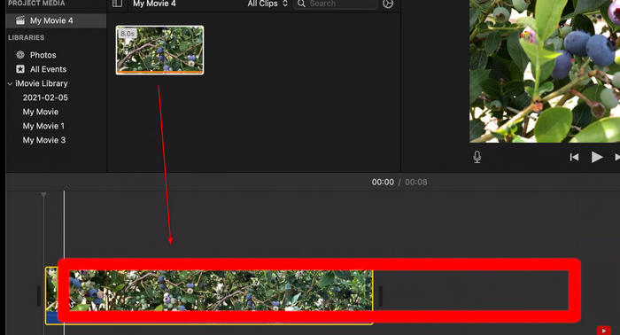 Step 2Your MOV video is added. You should drag and drop it in the timeline. Although you don't need to edit the video, you still need to put it in the timeline, or you can not start converting MOV to MP4 on iMovie.