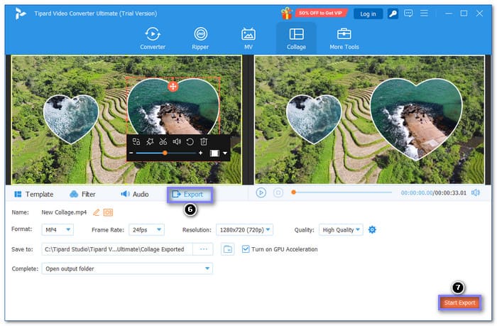Step 5 Once everything looks perfect, click Export. Choose a file name, format, frame rate, resolution, and quality. After that, click Start Export to create your video collage. Now your video collage is ready.