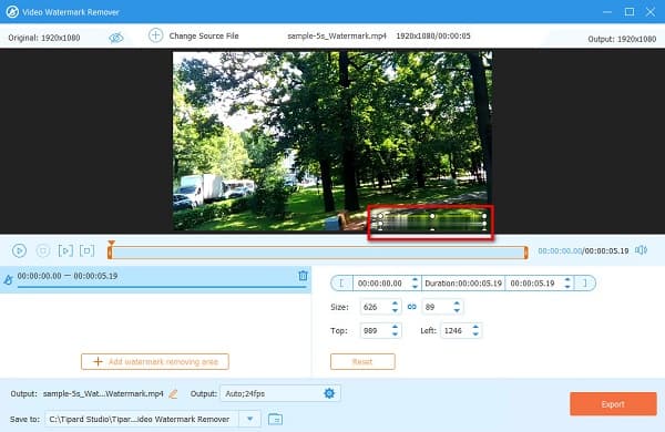 Step 4 And then, tick the Add watermark removing area button. On the next screen interface, you will see a watermark removing the box and a preview of your video file. Move the watermark-removing area to the DaVinci Resolve watermark from your video.