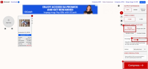 XConvert is an online video compressor that you can use for free. This application is also an alternative if you search for how to compress files in VLC. In addition, you can reduce the size of your video with four options: by adjusting the file size percentage, preset with CRF, variable bitrate, and constant bitrate. Also, it has an easy-to-use interface and is safe to use. Moreover, you can select the output format of your video and the codec you like. What's more is that you can choose the files you want to compress from your device, Dropbox, or Google Drive. But the drawback of this tool is that it has many pesky ads that might be disturbing.