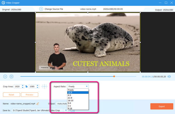 To change the aspect ratio of YouTube videos effectively, you must use the right tools, like Tipard Video Converter Ultimate. Under the program's Video Cropper, it provides an Aspect ratio section you can navigate. With this function, you can set the video's aspect ratio based on your preference. You can change them into 1:1, 16:9, 9:16, and more. Plus, the tool allows you to make some changes quickly due to its simple-to-understand layout. Plus, what makes it powerful is it can still preserve the video quality after the process.